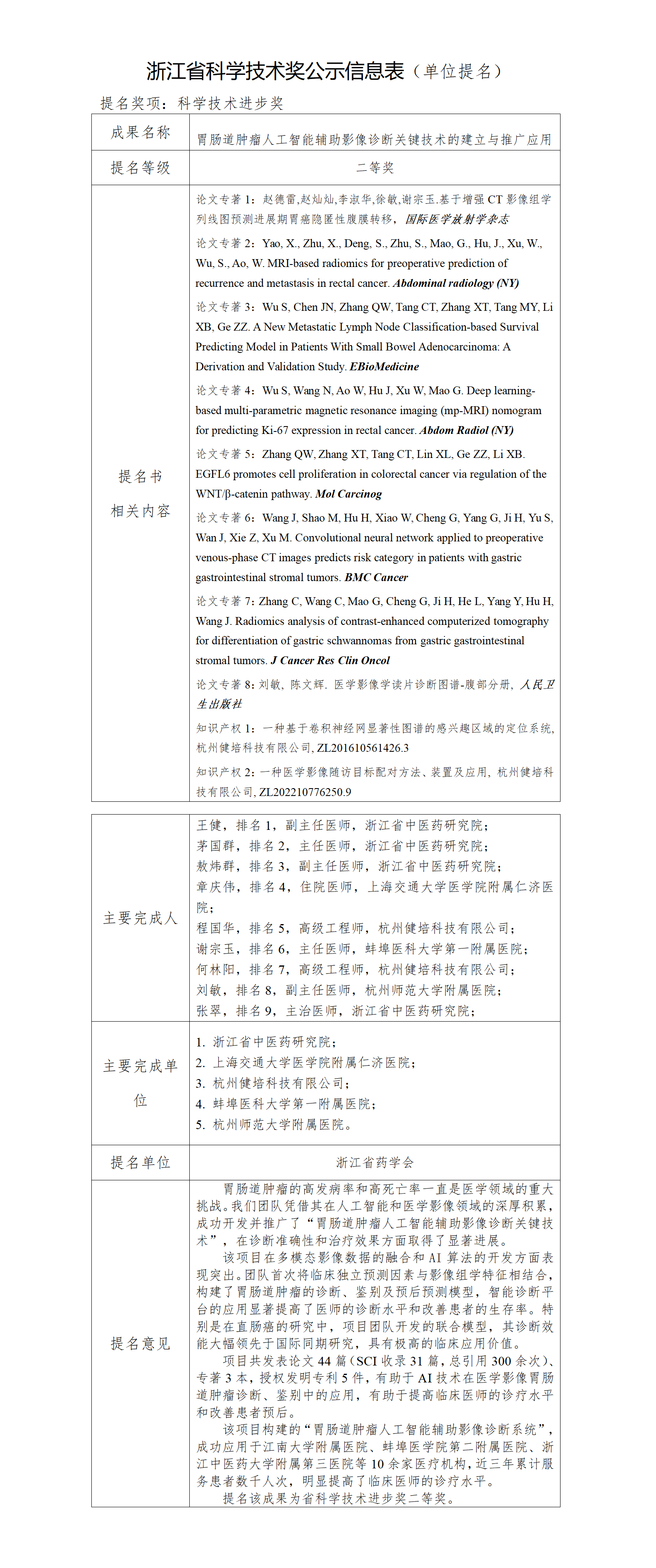 根據(jù)《浙江省科學(xué)技術(shù)廳關(guān)于開展2023年度浙江省科學(xué)技術(shù)獎提名工作的通知》要求,公司參與的項目《胃腸道腫瘤人工智能輔助影像診斷關(guān)鍵技術(shù)的建立與推廣應(yīng)用》擬提名2023年度浙江省科學(xué)技術(shù)進步獎,現(xiàn)將項目提名予以公示(見附件)。