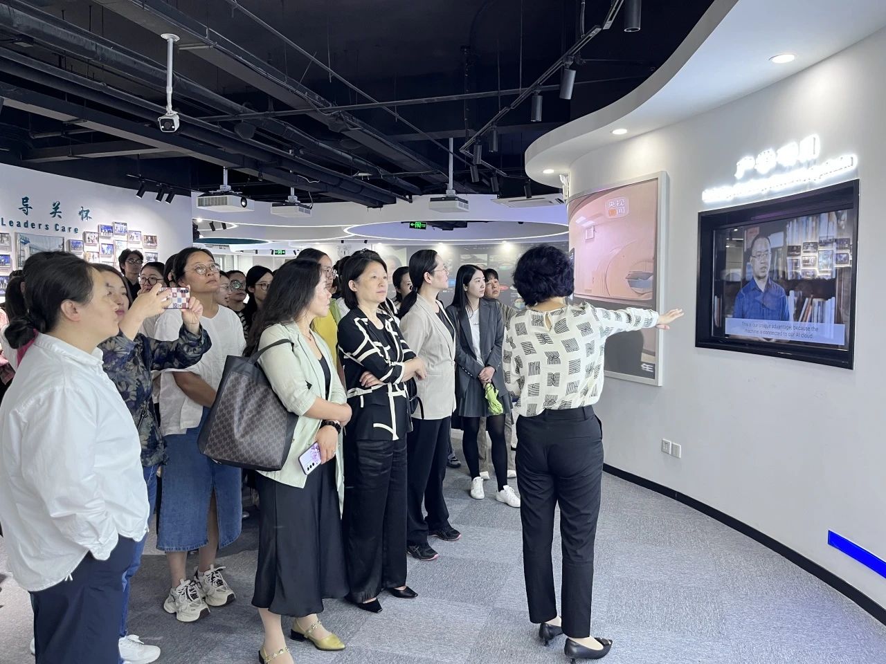 全國三八紅旗手、全國杰出創(chuàng)業(yè)女性、全國巾幗建功標(biāo)兵、浙江省政協(xié)委員、杭州市婦聯(lián)執(zhí)委、杭州市女知識分子聯(lián)誼會會長、健培科技婦聯(lián)主席、聯(lián)合創(chuàng)始人季紅麗;健培科技婦聯(lián)副主席閆亞亭;健培科技婦聯(lián)執(zhí)委、黨支部書記謝金波熱情接待。季總帶領(lǐng)考察團(tuán)參觀了健培科技醫(yī)療AI國際創(chuàng)新中心,詳細(xì)介紹了公司的基本情況,以及公司促進(jìn)、扶持并服務(wù)女性創(chuàng)新創(chuàng)業(yè)的情況,并展示了人工智能在醫(yī)療健康行業(yè)的創(chuàng)新應(yīng)用。季總還分享了健培婦聯(lián)利用人工智能、云計算、大模型等新興技術(shù)融入基層健康管理工作中,保障婦女、兒童以及老人群體的健康權(quán)益,通過啄醫(yī)生AI診室載體對社區(qū)居民的健康體征進(jìn)行日常監(jiān)管,有效發(fā)揮婦女獨(dú)特作用,是推進(jìn)健康領(lǐng)域婦女組織建設(shè)重要舉措。