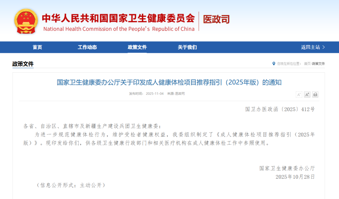 11月4日,國家衛(wèi)健委發(fā)布了《成人健康體檢項(xiàng)目推薦指引(2025年版)》,旨在為進(jìn)一步規(guī)范健康體檢行為,維護(hù)受檢者健康權(quán)益,促進(jìn)健康體檢事業(yè)發(fā)展。