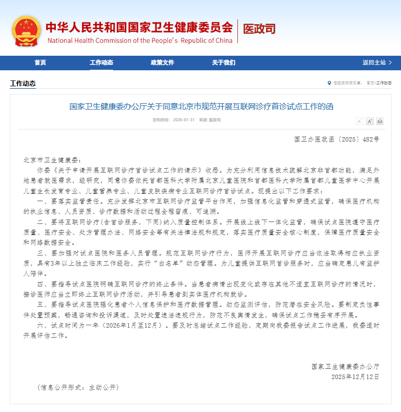 1月31日,國家衛(wèi)生健康委辦公廳在官網(wǎng)公布《關(guān)于同意北京市規(guī)范開展互聯(lián)網(wǎng)診療首診試點工作的函》,同意北京市衛(wèi)健委依托北京兒童醫(yī)院和首都兒童醫(yī)學(xué)中心作為試點醫(yī)療機構(gòu),生長發(fā)育、營養(yǎng)、皮膚疾病3個亞專業(yè)作為試點診療專業(yè),開展互聯(lián)網(wǎng)診療首診試點,試點自2026年1月至12月。